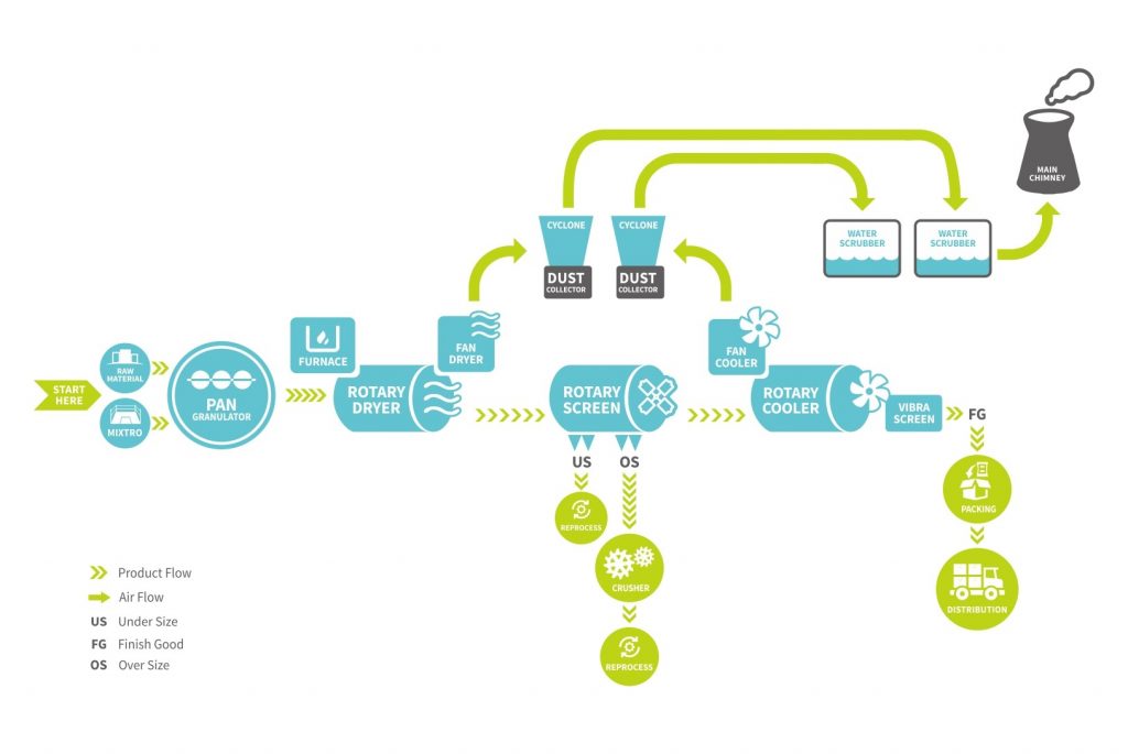 Counter curent system has furnace in rear of the dryer. It mean wet product will face the coldest spot just after come inside to the dryer. And than gradually come inside to the dryer and the temperature will increase gradually. At the same time the moisteru content also decrease to the intended level. This system is very suitable for Guano Phosphate and NPK fertilizer. When it still wet, the product will be brought into the dryer and at the same time the granules will be compressed by a rotating motion in the dryer. So the it will increase the granule hardness. And at the same time will lowering the moisture content gradually.